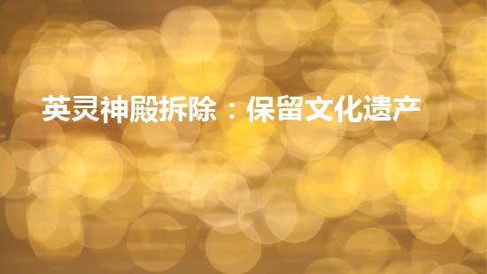 英灵神殿作为文化遗产,代表了特定的历史和文化背景,拆除时需要权衡考虑。可以将英灵神殿的文物进行移走和保留,用于传统文化展览和研究,同时也可以在新建筑中融入一些保留下来的文物元素,以此保护和传承文化遗产。