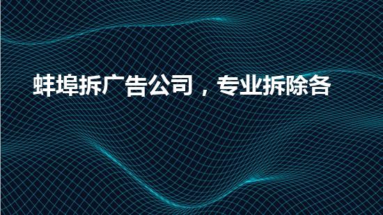 蚌埠拆广告公司是一家专业拆除各类广告牌的公司。他们秉持着安全高效、服务周到的理念,拥有一支专业的拆除团队,能够为客户提供高品质的拆除服务。本文将从多个方面详细介绍这家公司的优势和特点,以期帮助读者更好地了解和认识该公司。