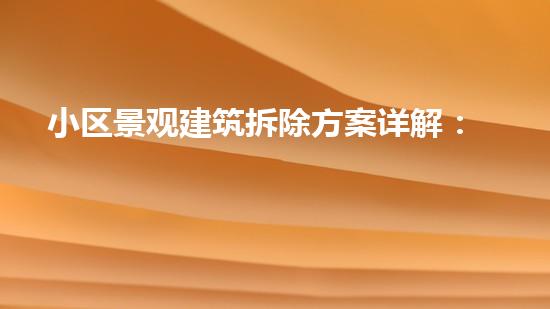 在计划拆除小区景观建筑之前,我们需要制定一套拆除方案。设计方案的重点在于如何降低施工噪音、震动等对周边环境的影响以及如何保障工人的安全。首先,我们需要对建筑进行全面评估,包括材料、体量、布局等,然后结合建筑物周边环境、道路交通情况,制定合理的拆除顺序以及拆除方式。对于高层建筑,我们可以采用爆破技术,在同时考虑到建筑物的结构特点和周边环境的基础上,制定最佳的爆破方案。对于低层建筑而言,可以通过采用钻孔冲击等方式分段进行破除和拆卸。
