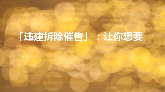 摘要本文讨论了拆除行业中的一个重要问题——违建拆除催告对业主的影响,以及为什么业主可能会想要保外就医。首先,本文讲述了此问题的背景和重要性,引发读者的兴趣。然后,本文从4-6个方面进行详细阐述,包括设...