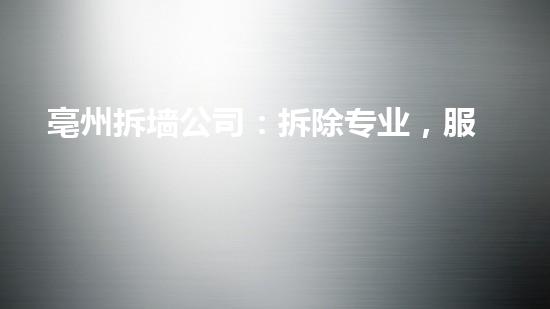 亳州拆墙公司是一家拆除专业,服务一流的公司。文章将从拆除行业专家的角度出发,介绍亳州拆墙公司的技术优势、服务质量、环保意识以及未来的发展方向,为读者提供全面的了解和参考。