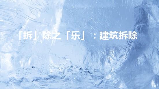 「拆」除之「乐」:建筑拆除视频合集教程全集是一本涵盖了建筑拆除工作方方面面的经验总结,不仅能够帮助拆除工程师提高自己的专业技能,还能够提高整个工程的执行效率。从文章中可以看出,任何一项工作的成功,都离不开复杂的设备、高超的技艺、丰富的经验和良好的环境保护意识。此外,在工作过程中重视实践经验和进一步加强培训、研究,可以为人们在建筑拆除行业中打下更坚实的基础。